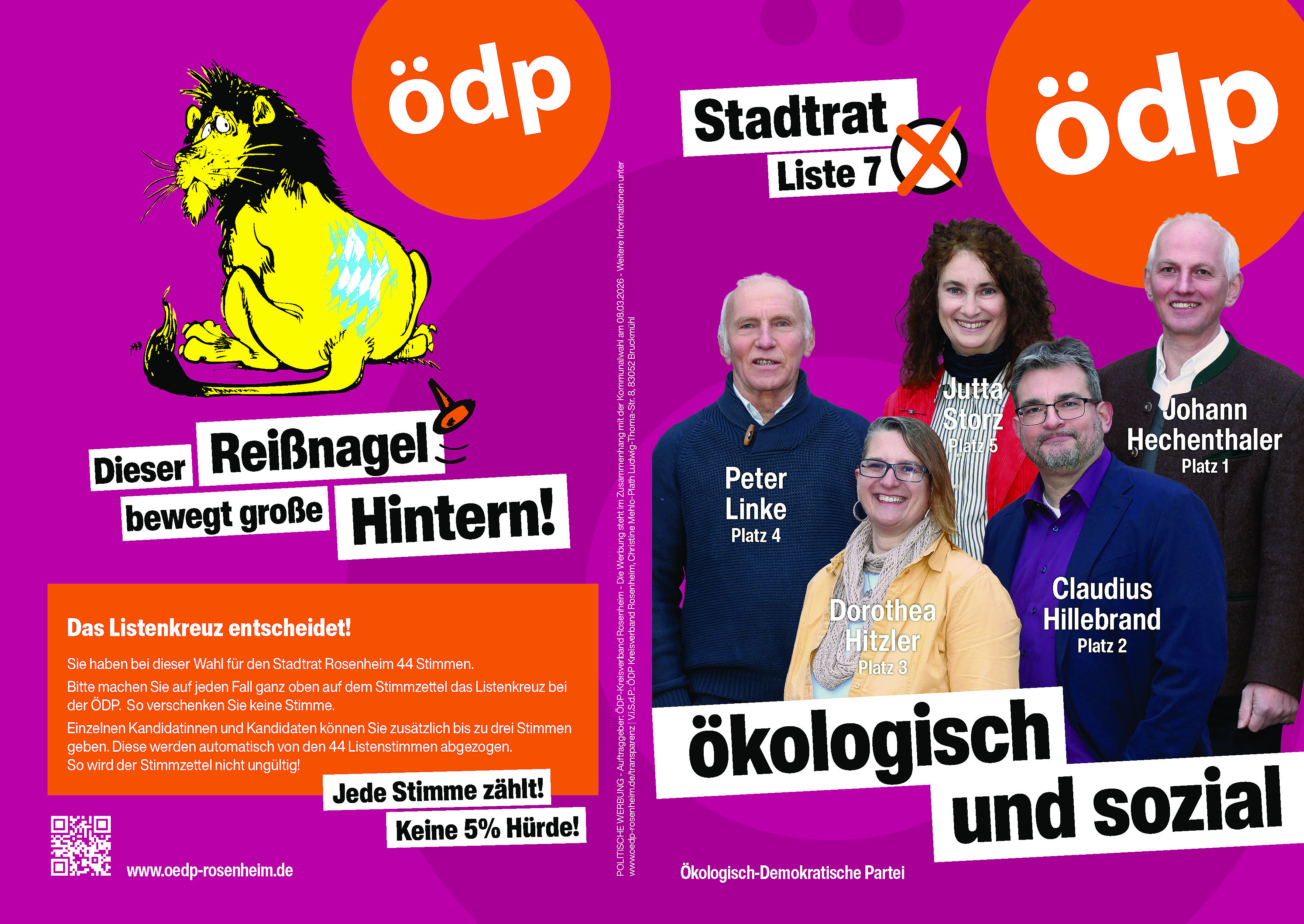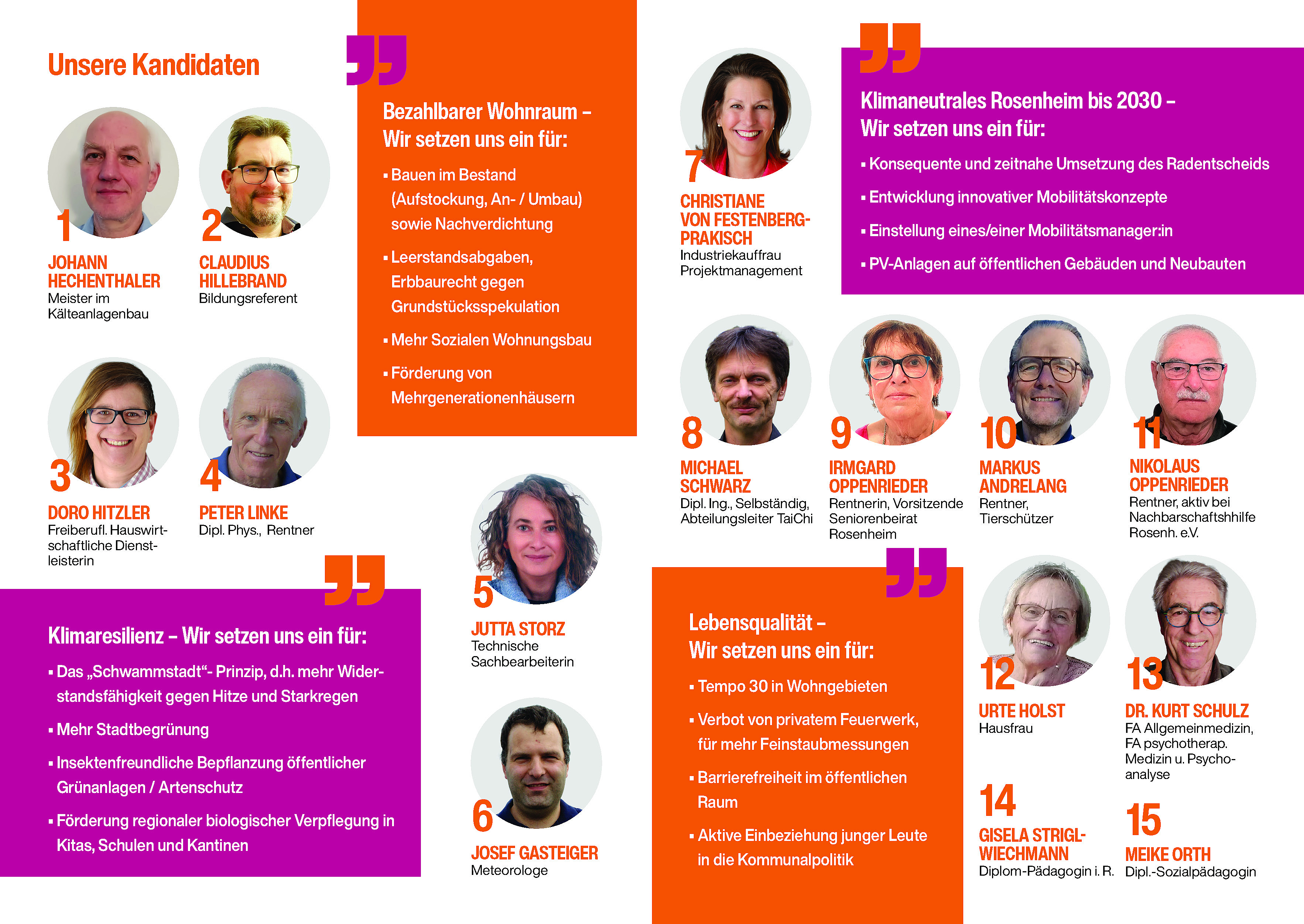 Weitere Kandidierende auf der Rosenheimer ÖDP-Liste: Josef Gasteiger, Pl. 6, Christiane von Festenberg-Pakisch, Pl. 7, Michael Schwarz, Pl. 8, Irmgard Oppenrieder, Pl. 9, Markus Andrelang, Pl. 10, Nikolaus Oppenrieder, Pl. 11, Urte Holst, Pl. 12, Dr. Kurz Schulz, Pl. 13, Gisela Strigl-Wiechmann, Pl. 14, Maike Orth, Pl. 15